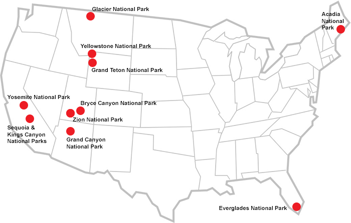 Lors de votre road trip, vous envisagez de visiter les parcs nationaux suivants :