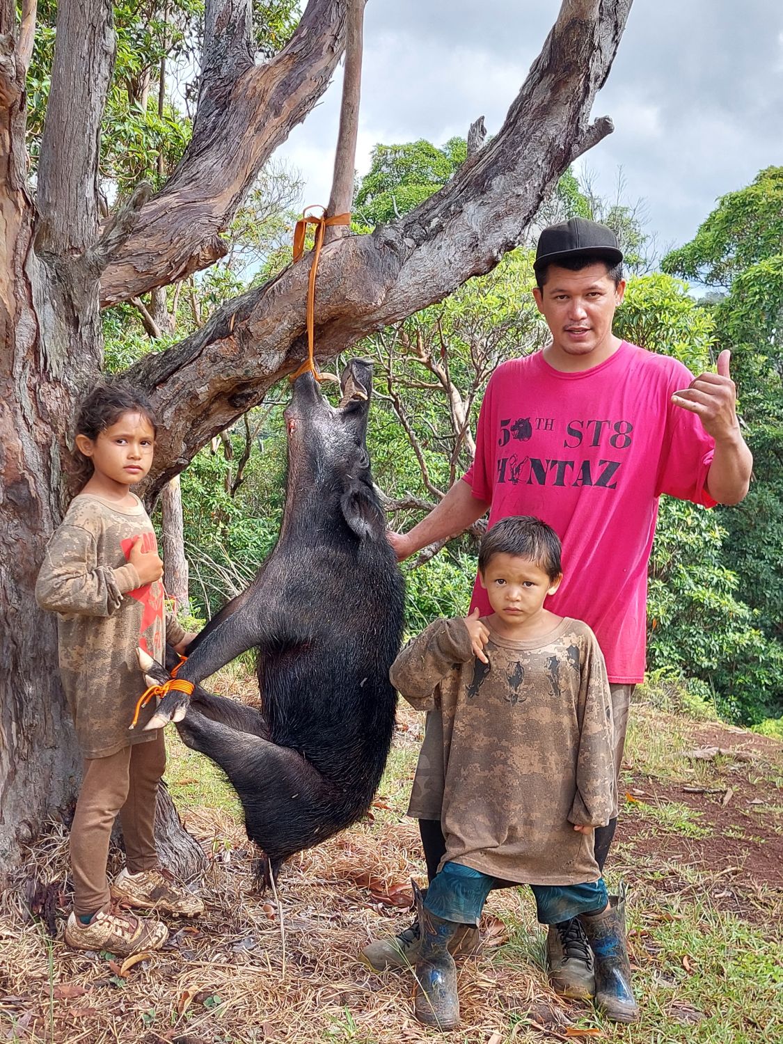 La faune de l’archipel se distingue par la présence d’une multitude d’oiseaux tropicaux aux couleurs chatoyantes, mais aussi par celle de cochons sauvages. Une randonnée nous a d’ailleurs offert une rencontre marquante avec un Hawaïen accompagné de ses deux enfants âgés d’une dizaine d’années. Lorsqu’il nous a interpellés pour nous proposer de voir un « cochon sauvage », nous imaginions observer un animal vivant, caché quelque part dans la végétation. La réalité était tout autre : derrière un arbre pendait un énorme porc sauvage à poils noirs, qu’il venait de chasser. Il avait pisté l’animal avec ses enfants jusque dans la vallée avant de l’acculer et de l’achever avec son seul couteau. Une prouesse d’autant plus impressionnante au regard de la difficulté du terrain, fait de ravins abrupts et boueux où nous avions nous-même des difficultés à nous déplacer, en restant pourtant sur le sentier.