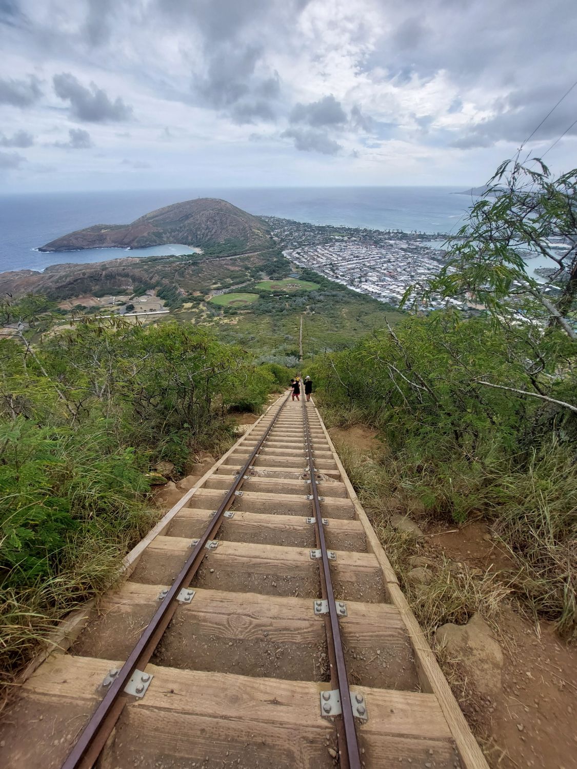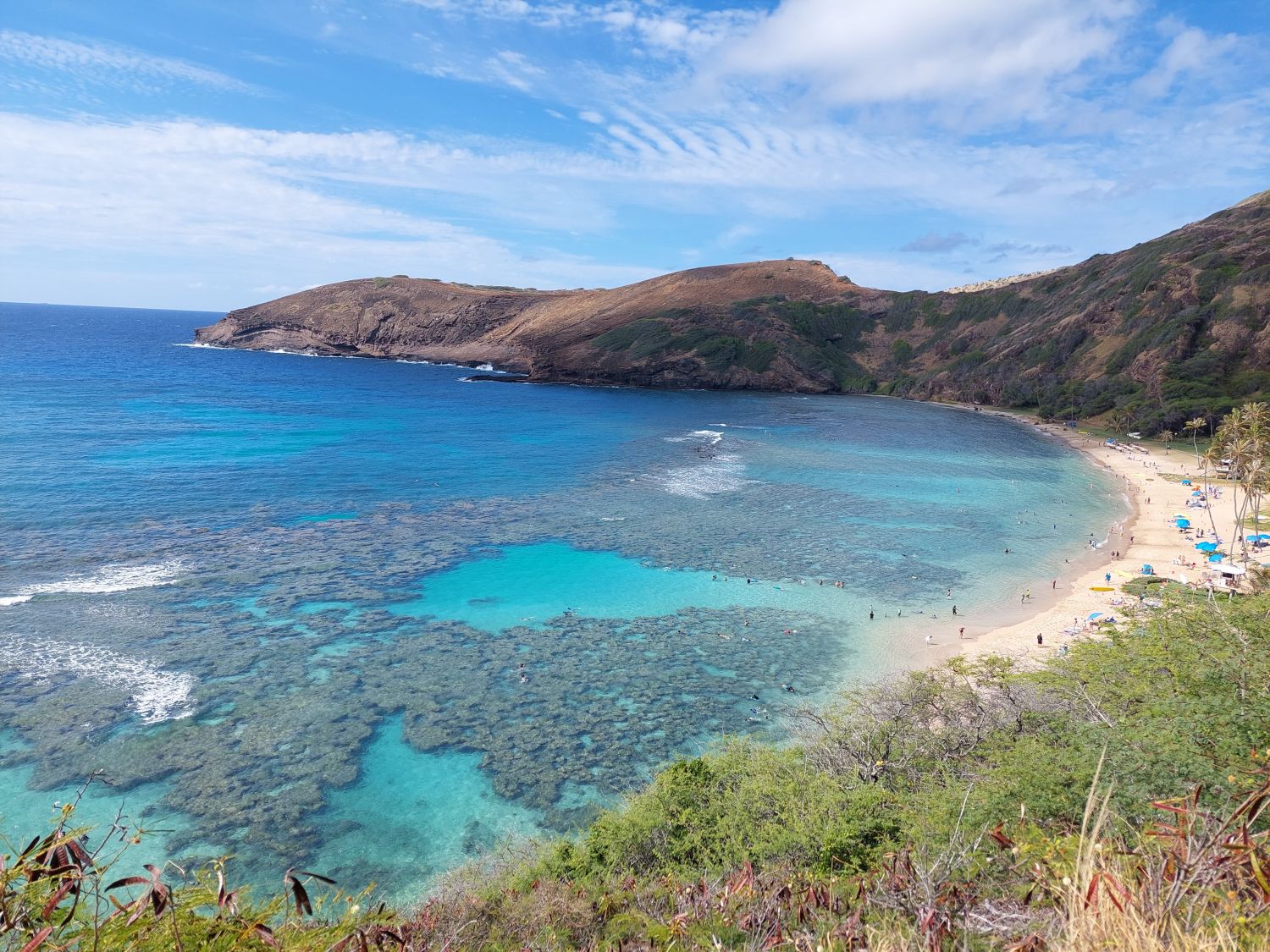 Le relief volcanique de l’île offre également des cadres spectaculaires pour la marche. Le Diamond Head National Monument permet ainsi de pénétrer, via un tunnel, au cœur d’un ancien cratère qui abritait une base militaire, avant de grimper sur les crêtes pour profiter d’une vue imprenable sur Honolulu. Pour les amateurs de défis physiques, le Koko Crater, situé non loin de là, propose une ascension quasi verticale le long d’une ancienne voie de funiculaire. S’apparentant à un immense escalier (ou à une échelle dressée vers le ciel), cette randonnée exigeante pour le cardio récompense l’effort par un panorama exceptionnel au sommet. Enfin, cette géologie volcanique particulière a façonné des sites uniques comme la Hanauma Bay, un ancien cratère partiellement effondré et ouvert sur l’océan, devenu un spot de snorkeling tout simplement magique.